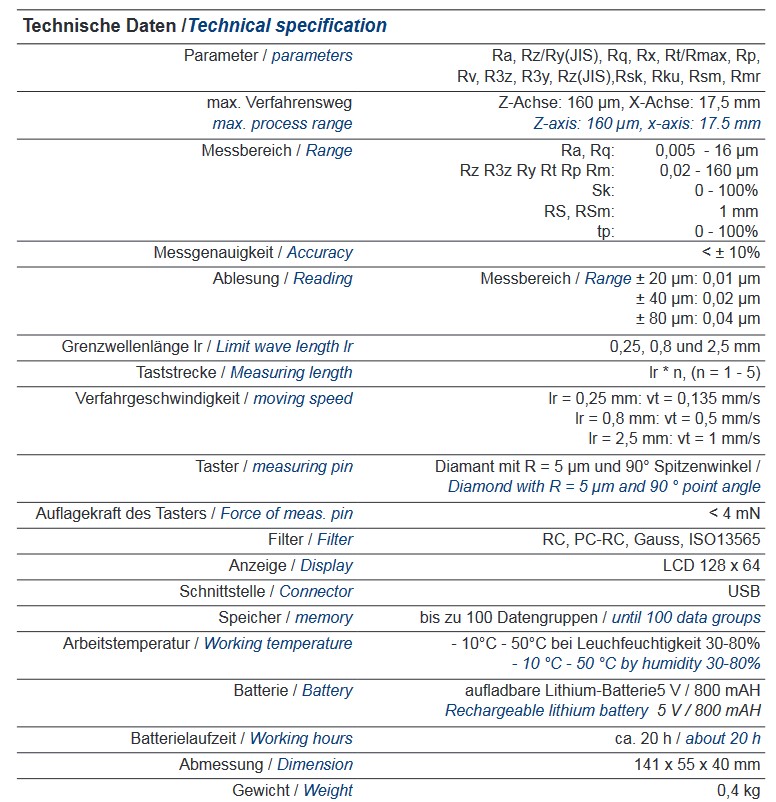- inclusive measuring pin, adjustable support, surface checking standard, protection case, charger, charging cable and case
